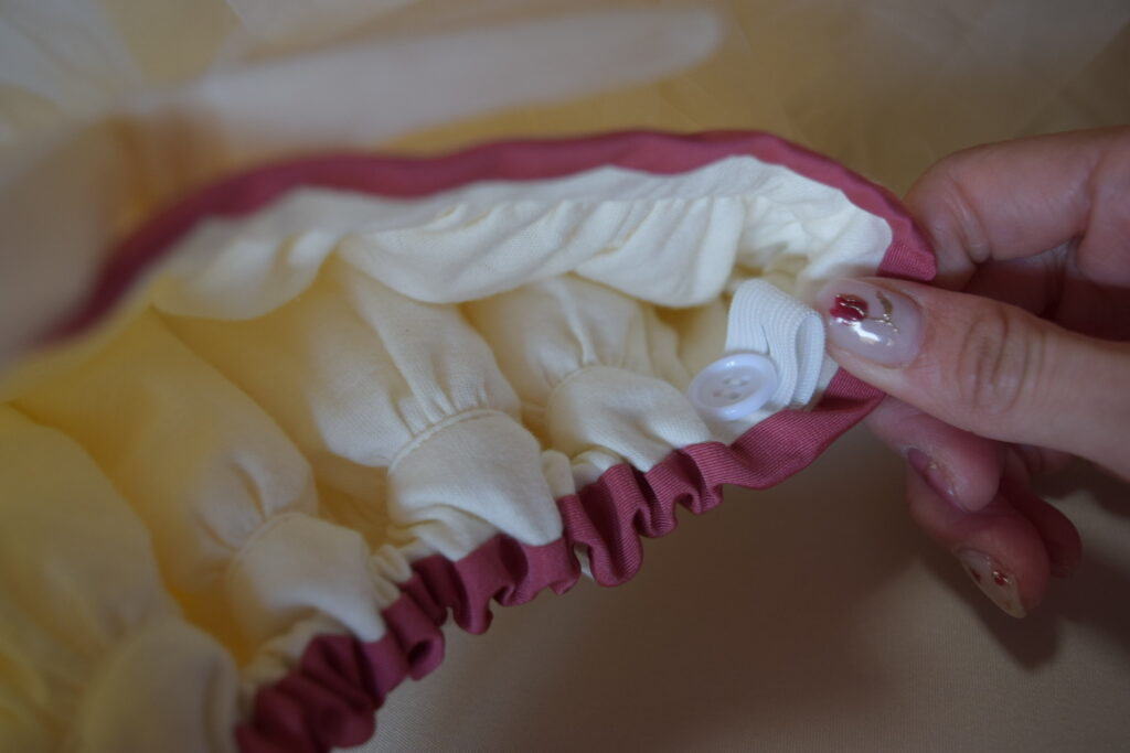 ルチュールは、後ろゴムのお作りです。調節ゴムを採用し、両側からボタンで調節出来るようにしております✨