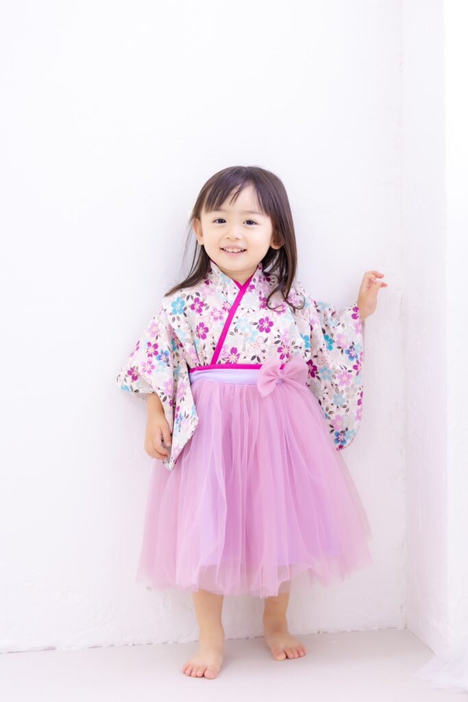 上着はピンクやブルーなど鮮やかな桜が特徴の生地を使用